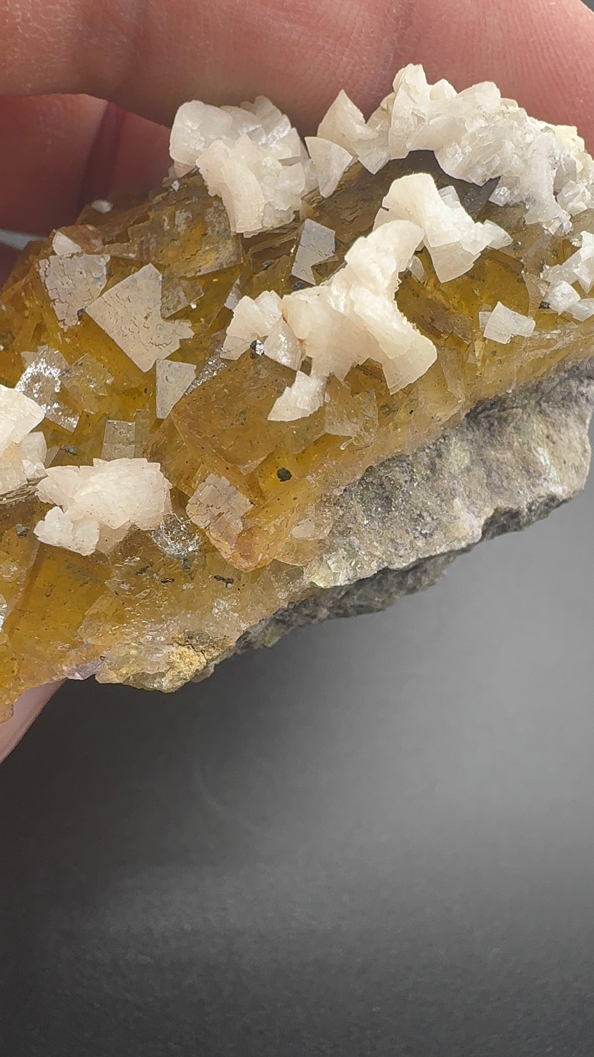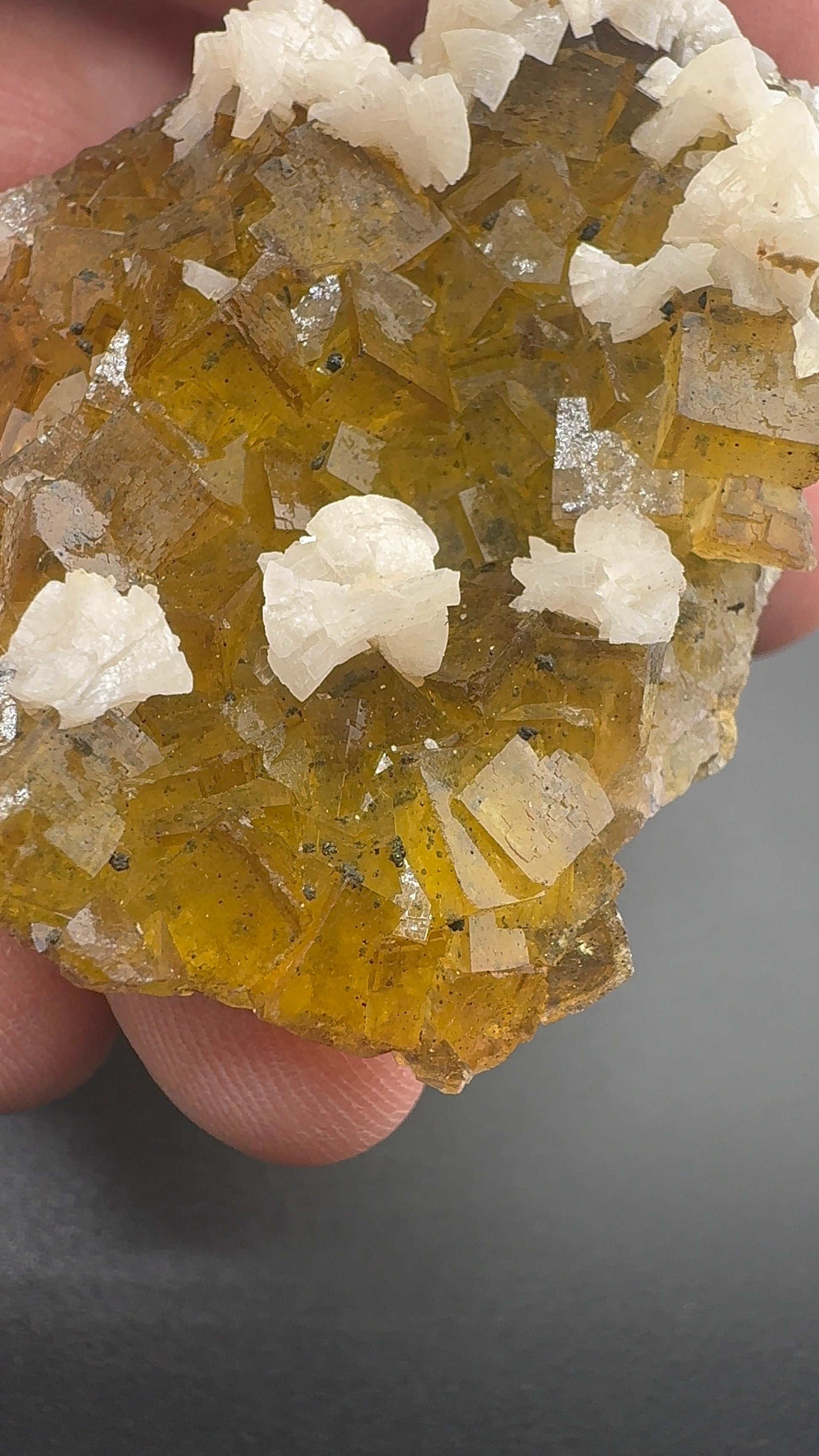 This specimen from Moscona Mine Spain, features clusters of honey-yellow fluorite in sharp cubic habit, each crystal generally less than 2 cm and exhibiting a bright, glassy luster. The translucent cubes allow light to pass through, creating an inner glow that highlights their warm golden tones.