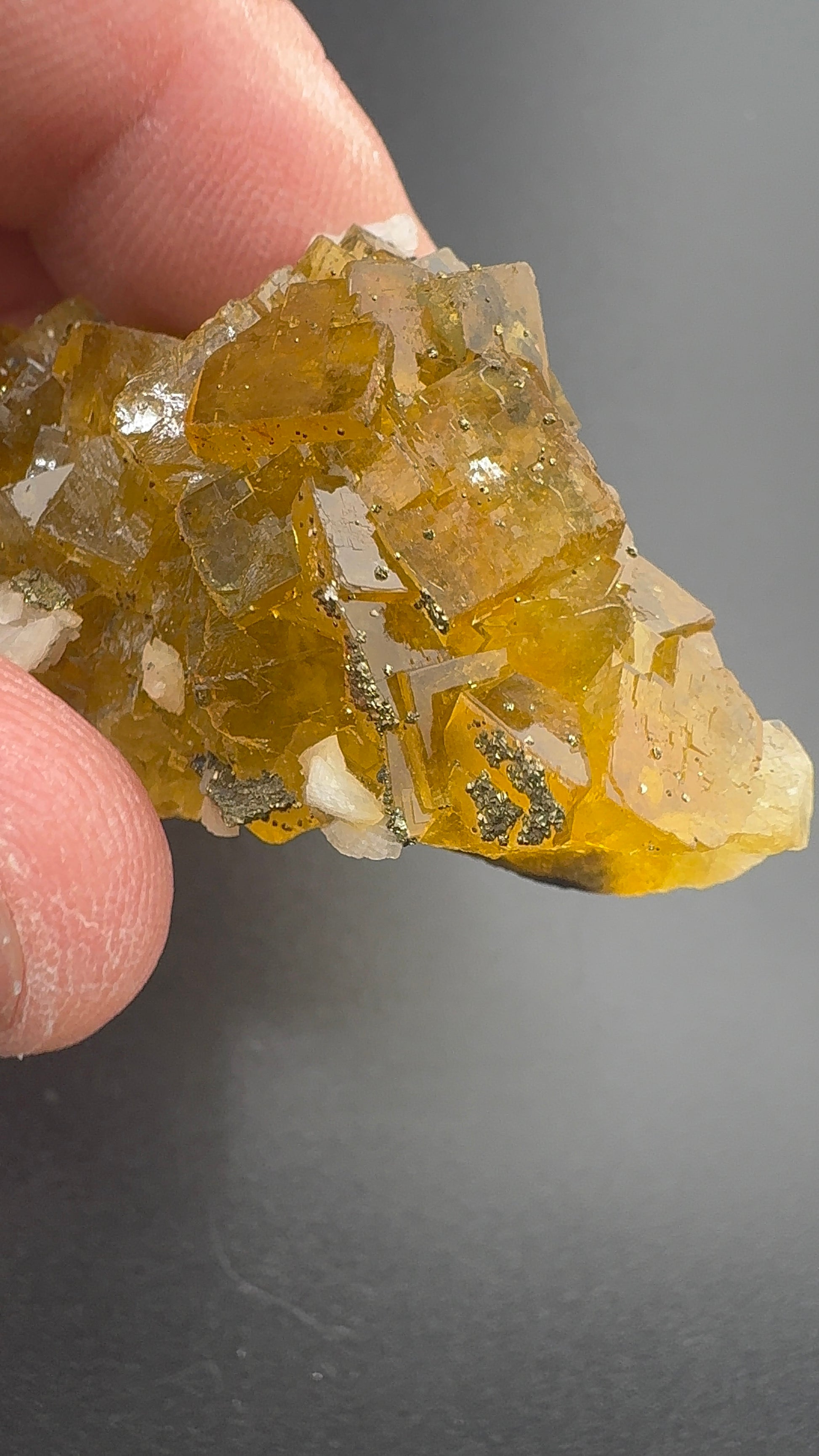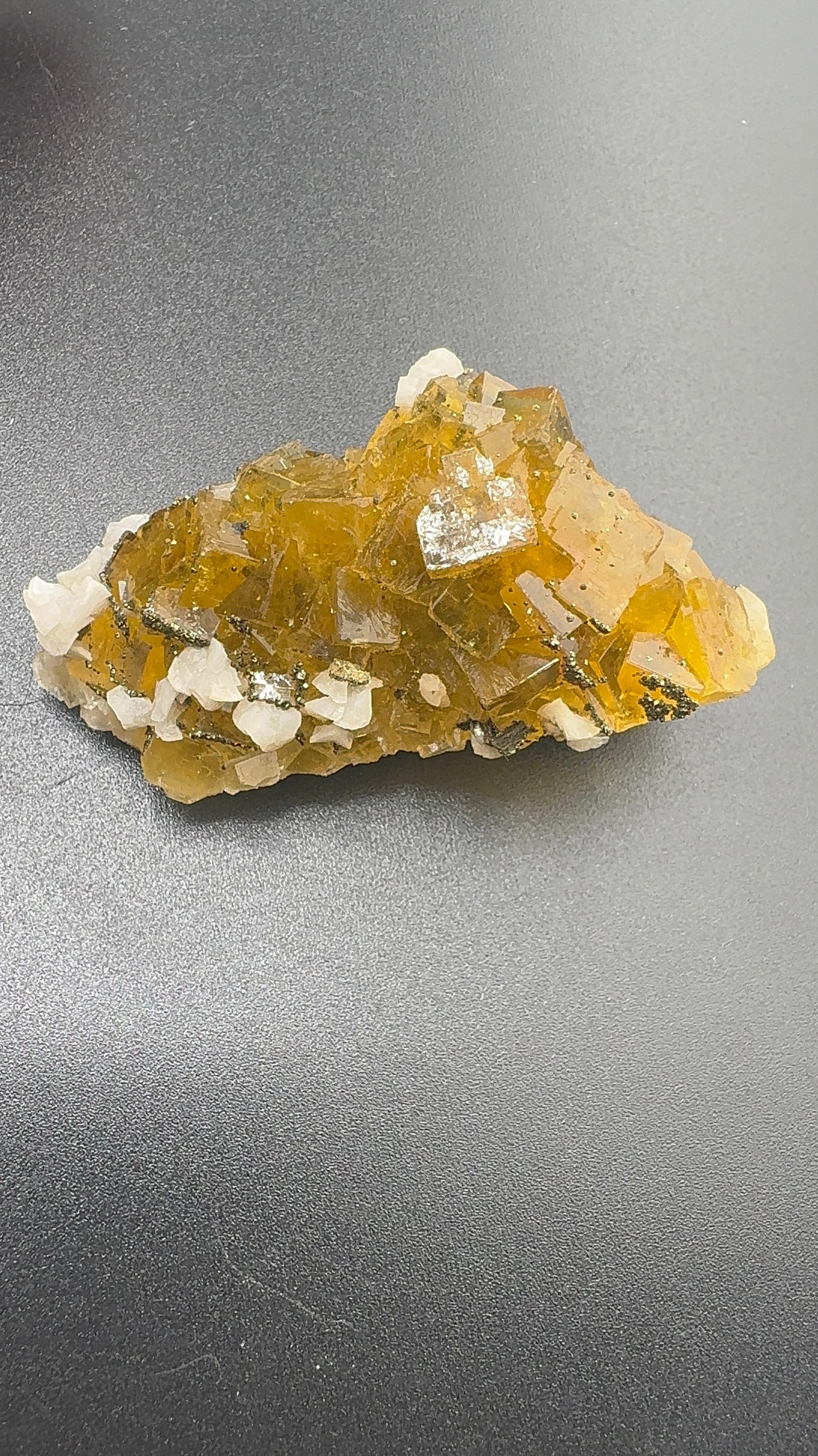 This specimen from Moscona Mine Spain, features clusters of honey-yellow fluorite in sharp cubic habit, each crystal generally less than 2 cm and exhibiting a bright, glassy luster. The translucent cubes allow light to pass through, creating an inner glow that highlights their warm golden tones.